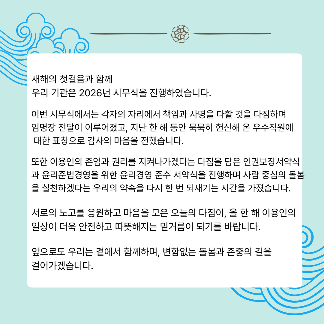 이용인 인권보장과 윤리경영을 위해 더 노력하는 한 해가 되도록 하겠습니다.